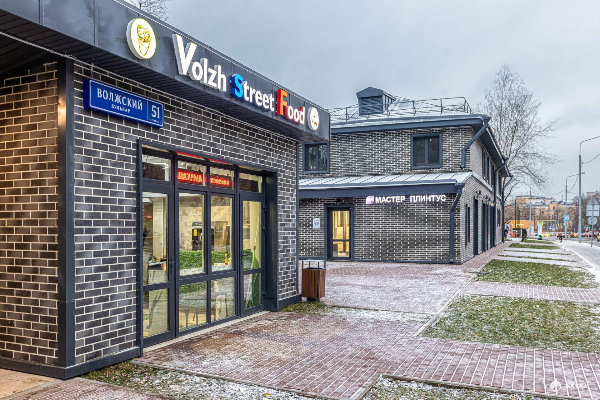 Отделка фасадов выполнена панелями с имитацией клинкерного кирпича. Дополнительно на территории организованы зоны отдыха на свежем воздухе, также дополнительно имеется возможность для организации летних веранд и кафе.