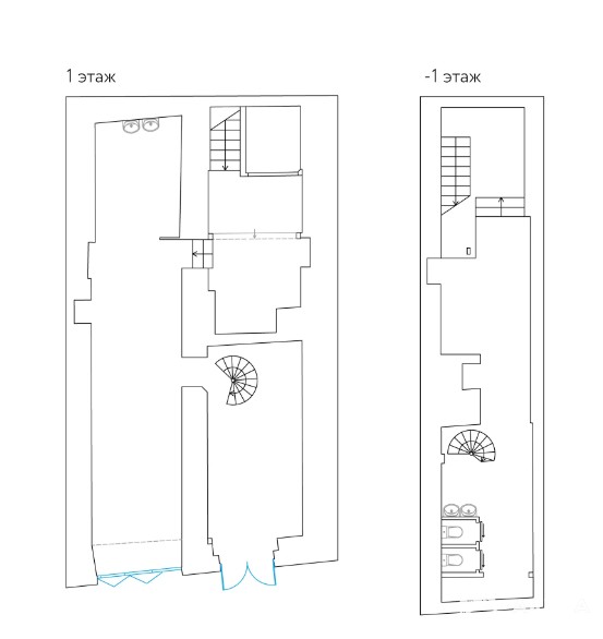 -1 этаж (цоколь): 28, 8 м² — может быть использован под кухню, технические помещения, винотеку или камерный зал.