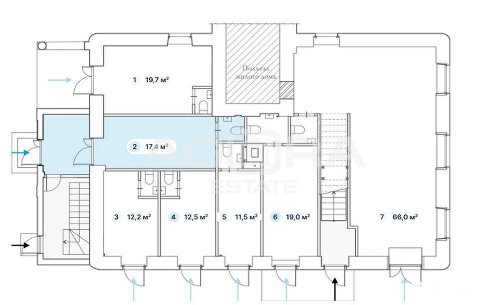 Площадь - 17, 4 м2. Полностью на 1-м этаже (на плане - блок 2). Отдельный вход с улицы. Планировка - открытая (сетка колонн). Состояние - под чистовую отделку. Все городские коммуникации. Место для размещения вывески на фасаде.