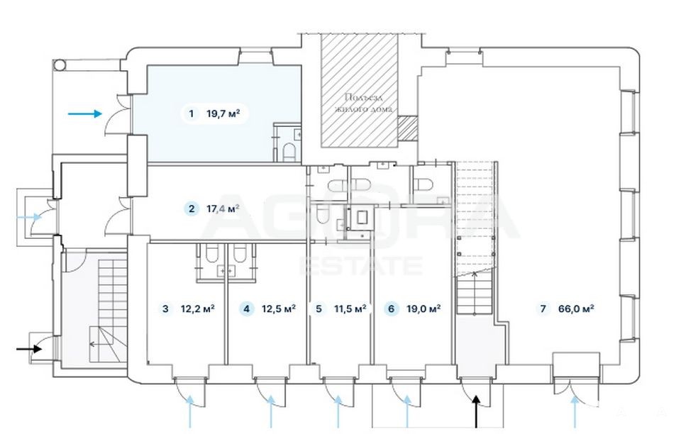Площадь - 19, 7 м2. Полностью на 1-м этаже (на плане - блок 1). Отдельный вход с улицы. Планировка - открытая (сетка колонн). Состояние - под чистовую отделку. Все городские коммуникации. Место для размещения вывески на фасаде.