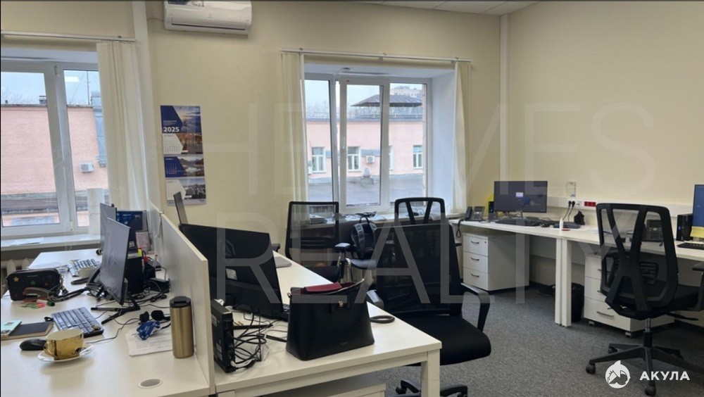 Технические характеристики помещения : перекрытия сборный железобетон, кровля плоская эксплуатируемая. Стены кирпич. Фасад окраска по кирпичу. Окна деревянные двойные, металлические со стеклопакетами. Входная группа тамбур-холл, оборудованный постом охраны. Полы линолеум, керамогранитная плитка, ковровое покрытие. Стены стеклообои, окраска водоэмульсионными составами. Потолок подвесной типа Армстронг. Высота потолков 1 этаж 3 м, 2 этаж, подвал 2, 4 м. Оборудовано 4 санузла.
