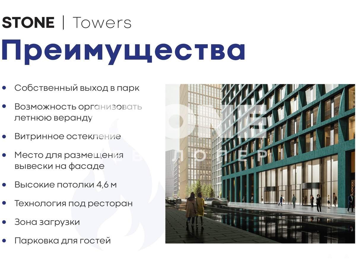 В реализации - помещение под ресторан с возможностью организации летней веранды в составе бизнес-центра класса А STONE Towers (башня D) напрямую от девелопера STONE, лидера офисного рынка.