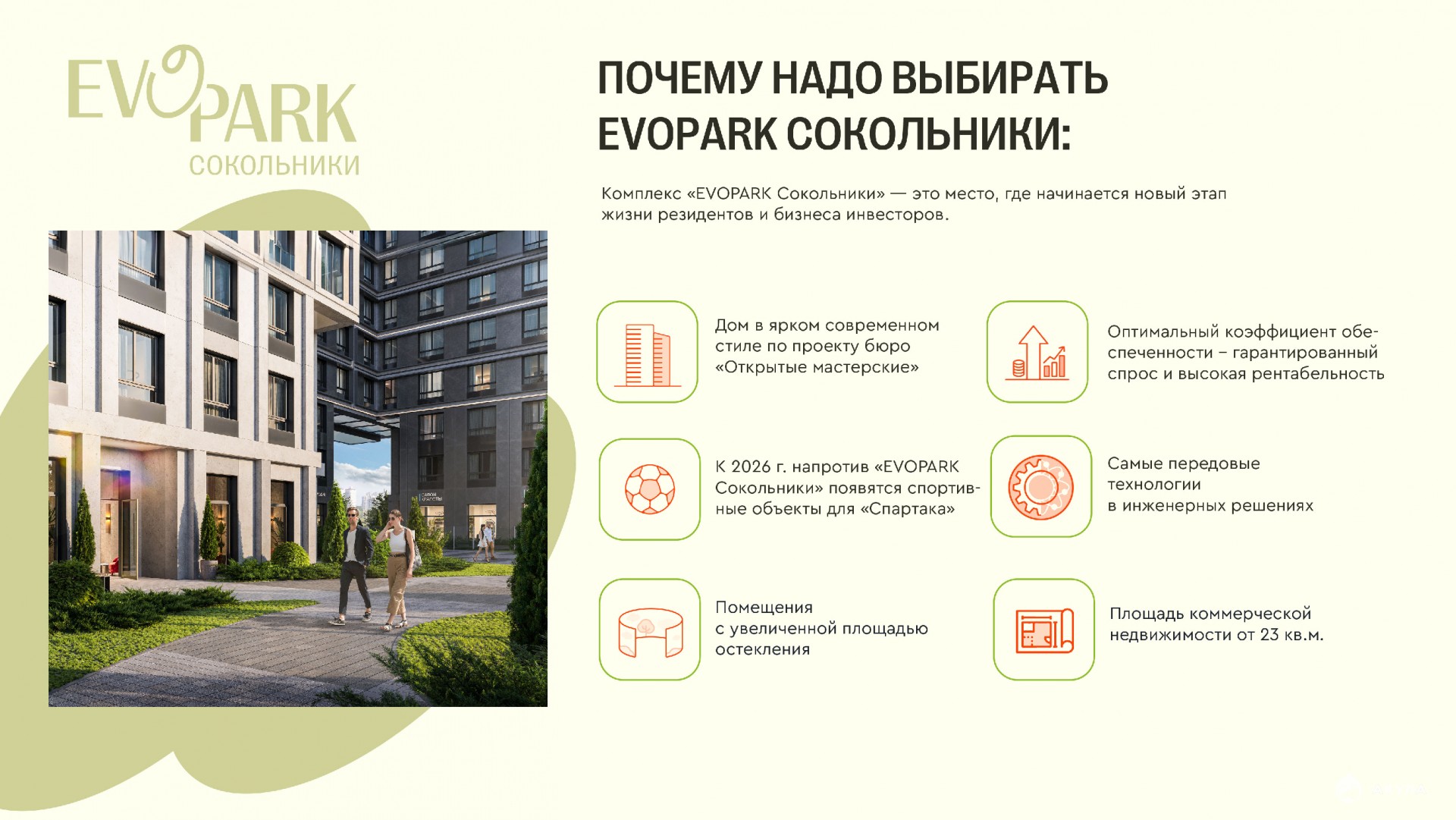 EVOPARK Сокольники — идеальное решение для ритейла и сферы услуг. EVOPARK Сокольники располагается в историческом районе Преображенское, который может похвастаться прекрасно развитой транспортной сетью. Район Сокольники — один из самых востребованных в Москве благодаря парковой инфраструктуре, спортивным и культурным объектам. Жители и гости района ежедневно гуляют по аллеям, посещают фестивали и мероприятия, что обеспечивает устойчивый клиентский поток для ритейла и сервисных форматов.