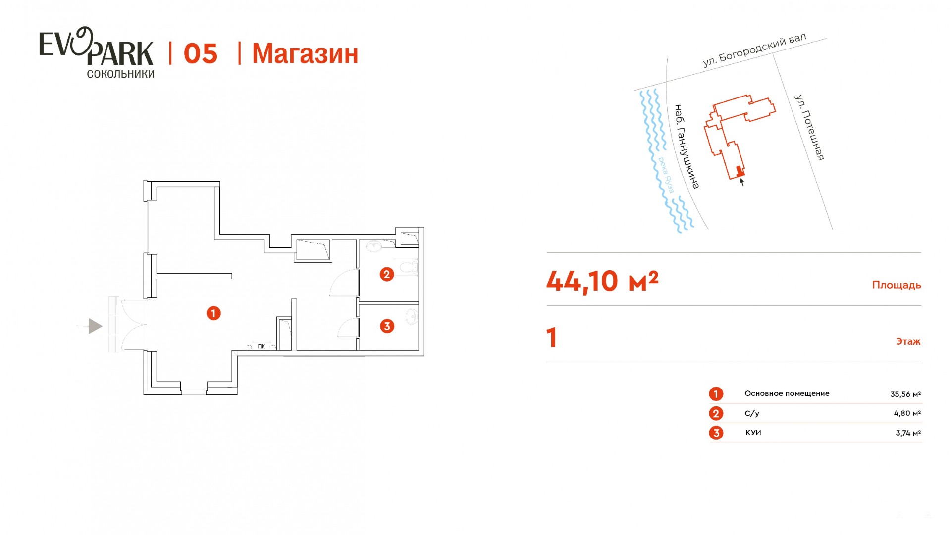 Продажа торгового помещения 44, 10 кв.м., расположенного на 1м этаже ЖК бизнес-класса EVOPARK Сокольники. Функциональное назначение – магазин. Коммерческая недвижимость в одном из самых востребованных районов Москвы.