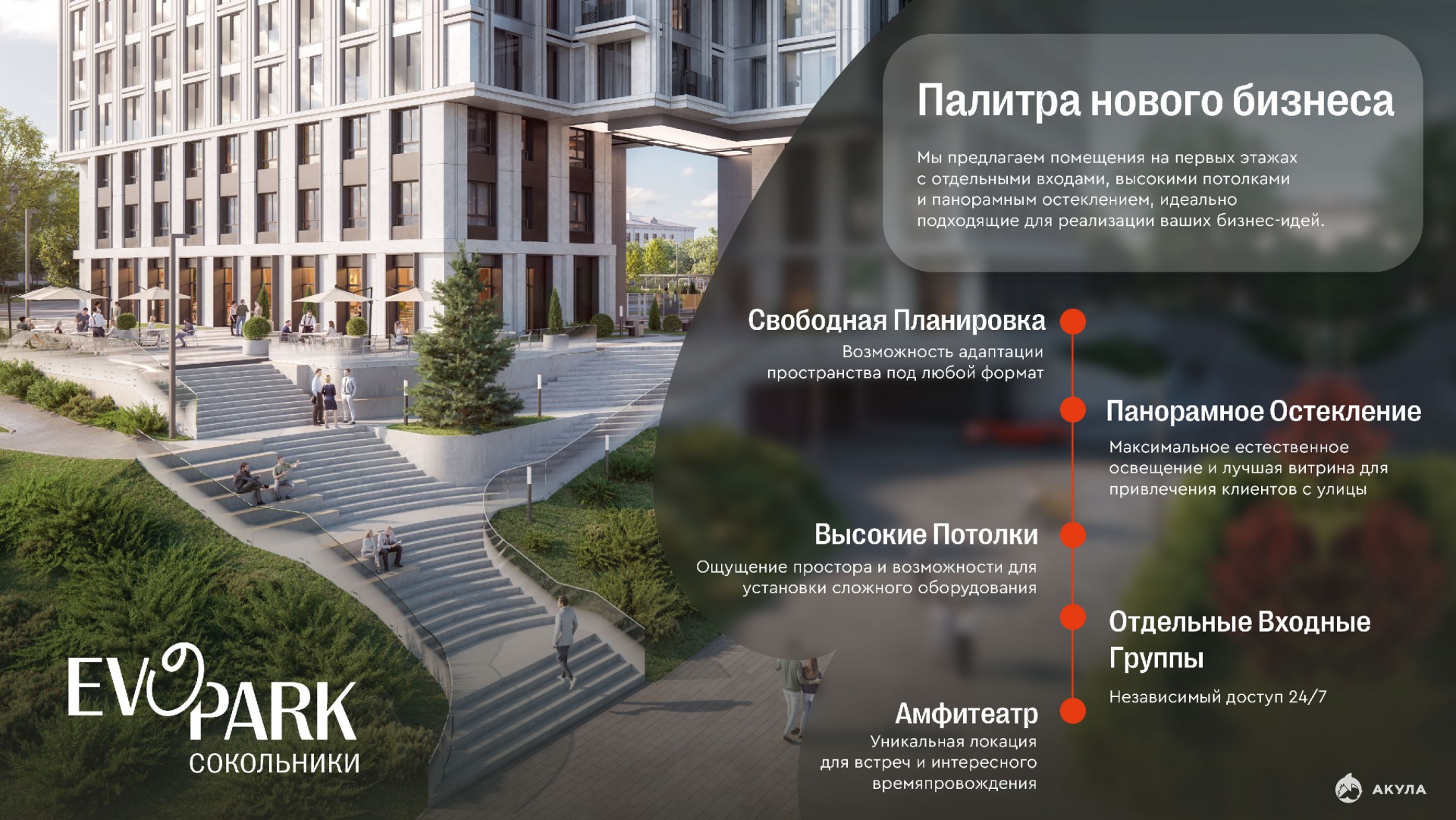 EVOPARK Сокольники — идеальное решение для ритейла и сферы услуг. EVOPARK Сокольники располагается в историческом районе Преображенское, который может похвастаться прекрасно развитой транспортной сетью. Район Сокольники — один из самых востребованных в Москве благодаря парковой инфраструктуре, спортивным и культурным объектам. Жители и гости района ежедневно гуляют по аллеям, посещают фестивали и мероприятия, что обеспечивает устойчивый клиентский поток для ритейла и сервисных форматов.