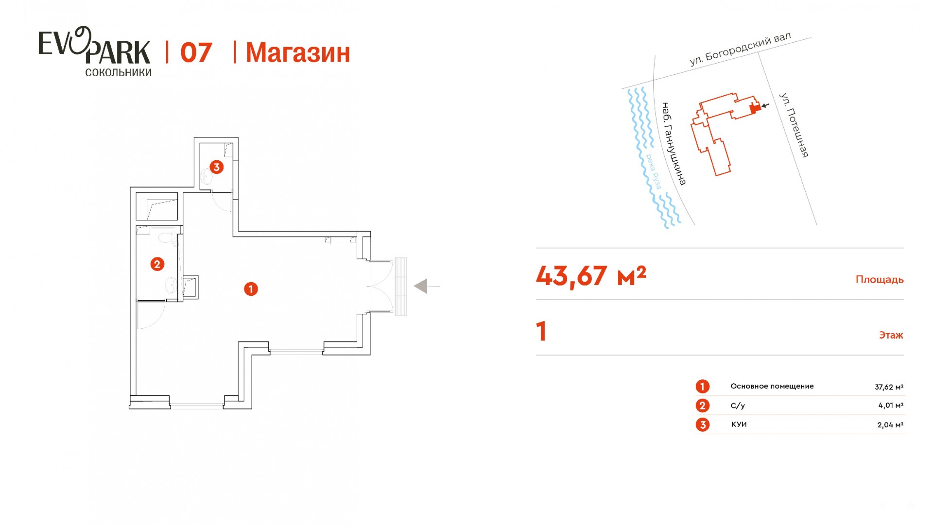Продажа торгового помещения 43, 67 кв.м., расположенного на 1м этаже ЖК бизнес-класса EVOPARK Сокольники. Функциональное назначение – магазин. Коммерческая недвижимость в одном из самых востребованных районов Москвы.