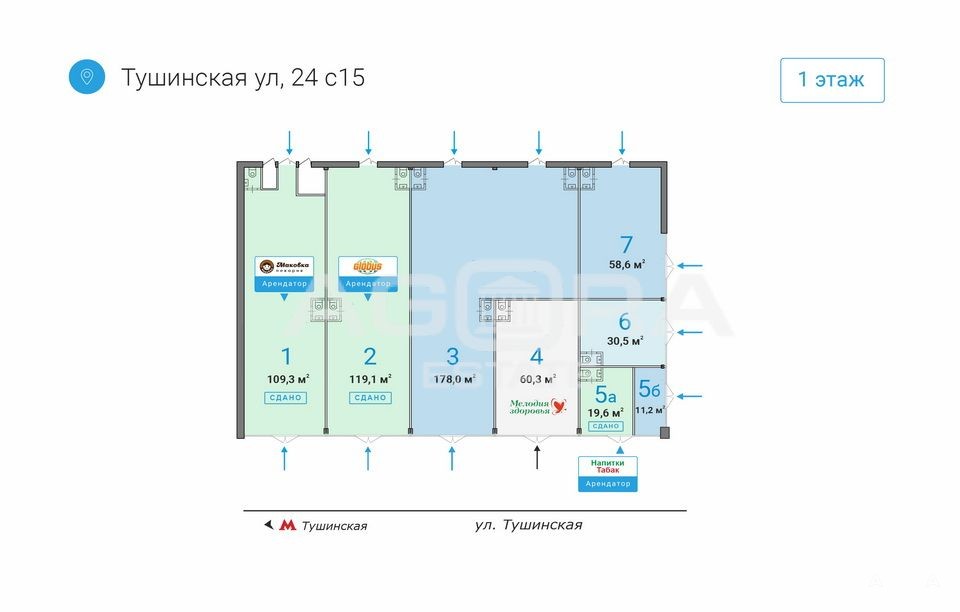 Продажа торгового помещения на выходе из метро Тушинская. Первая фасадная линия!!! 1 мин. от м. Тушинская. Предлагается на продажу помещение площадью 58, 6 кв.м (на плане № 7), расположенное на 1-м этаже административного здания 1988 года постройки. Отдельный вход с фасада, витринное остекление. Планировка свободная. Все городские инженерные коммуникации. Огромная проходимость, отличное торговое окружение и визуализация.Объект № 549034Номер объекта: #5/549034/310