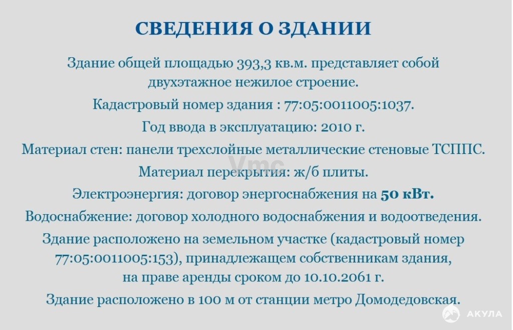 Здание расположено в 100 м от станции метро Домодедовская. Прямая продажа. Предусмотрен торг на ноябрь