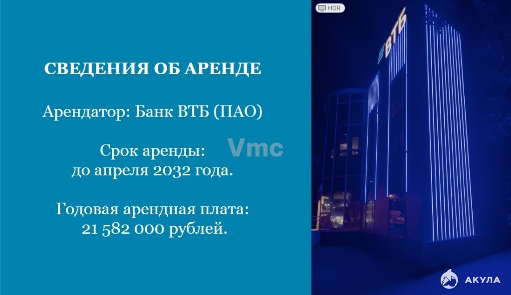 Арт. 89557678. Отдельно стоящее здание -393.3м Земельный участок находится в аренде. Продажа с действующим федеральным арендатором — Банком ВТБ до 32 года ГАБ 22млн. Устойчивый ежедневный поток посетителей. Плотный жилой массив. Здание общей площадью 393, 3 кв.м. представляет собой