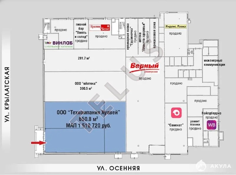 Торговое помещение площадью 650, 8 м² размещено на 1 этаже в торговом центре, имеет отдельный вход, панорамное остекление, Высота потолков - 7 м. В помещении выполнен хороший ремонт. Центральные инженерные коммуникации: водоснабжение, канализация, приточно-вытяжная вентиляция. Территория вокруг здания имеет асфальтовое покрытие. 4 км от МКАД по Рублевскому шоссе. Помещение продается с действующим арендатором: филиал китайской кампании HUAWEI .МАП - ДА - 5 лет, с индексацией - 5%, Объект №. AFY-800826362