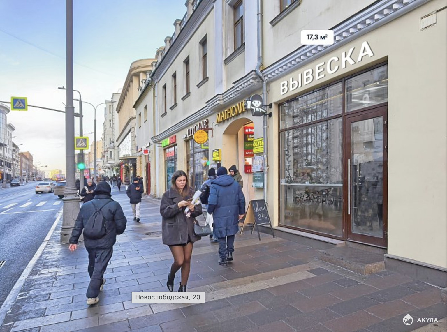 Интенсивные автомобильный и пешеходный трафики, отличная видимость с улицы.