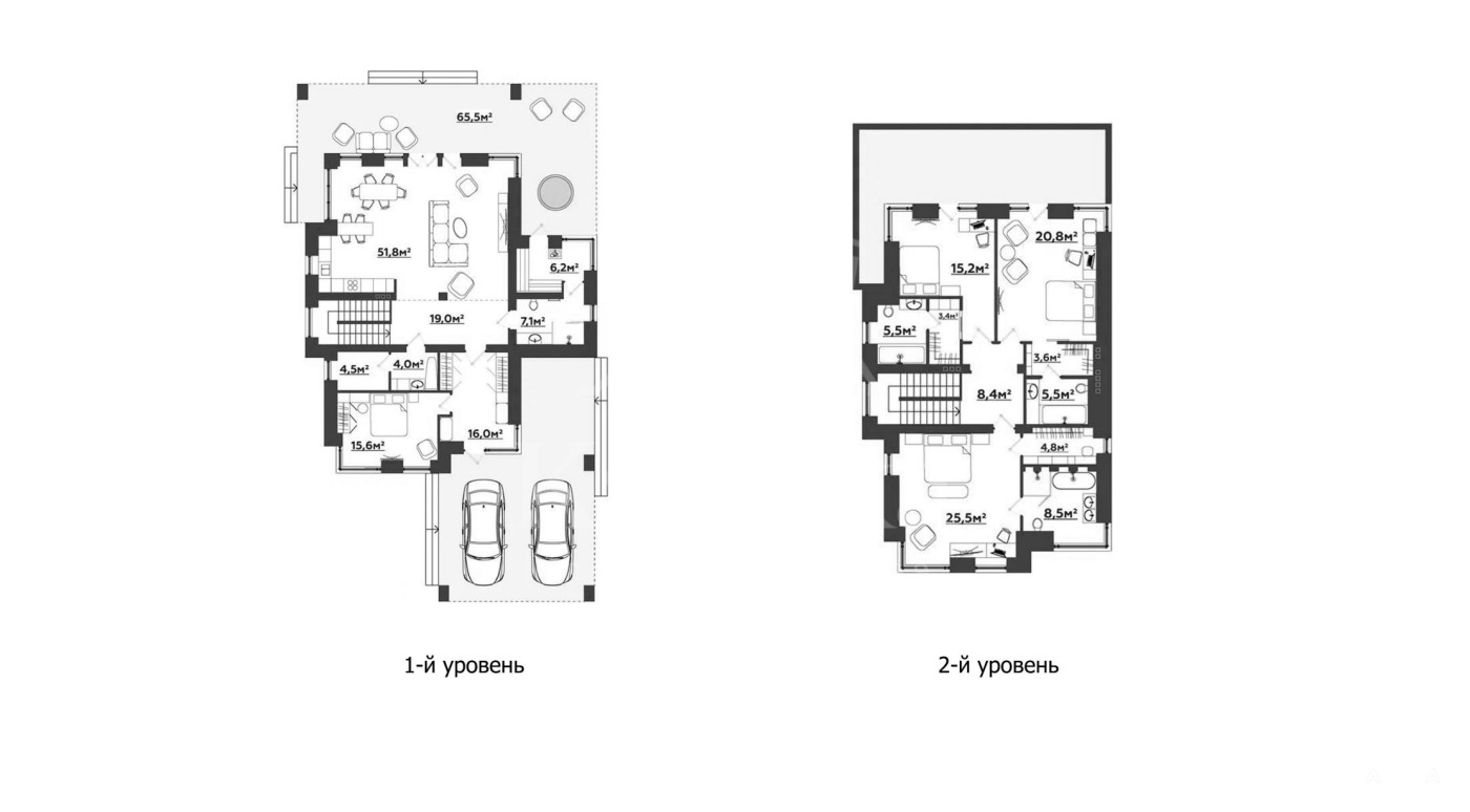 2 этаж: холл, мастер-спальня с гардеробной и санузлом, 2 спальни с гардеробными, санузлами и общим балконом.