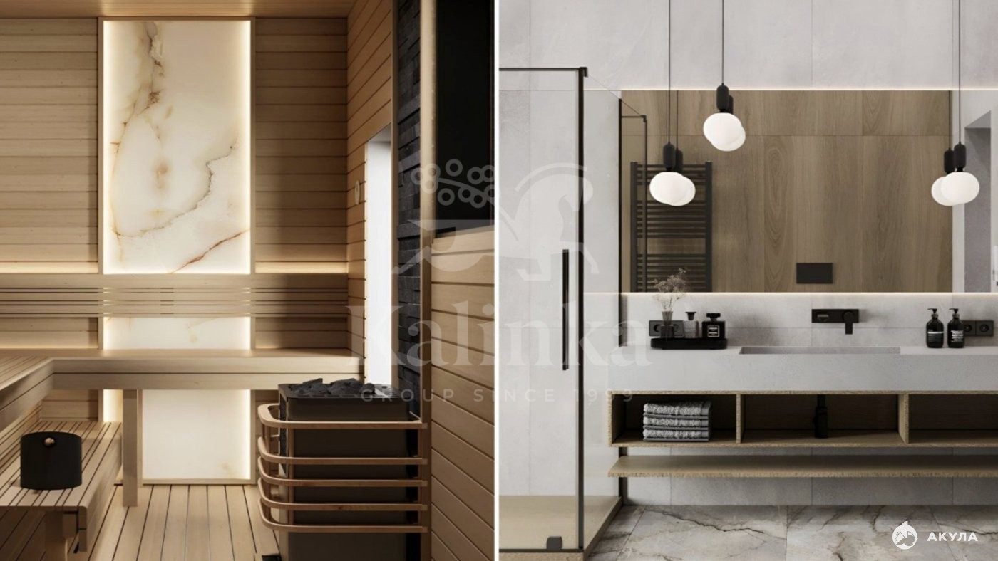 1 этаж: прихожая, кухня-гостиная-столовая, спальня, санузел, SPA-зона с сауной, душевой и санузлом, котельная-постирочная, терраса с купелью;