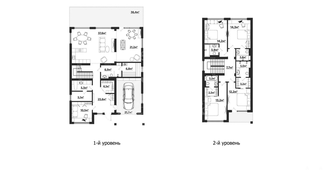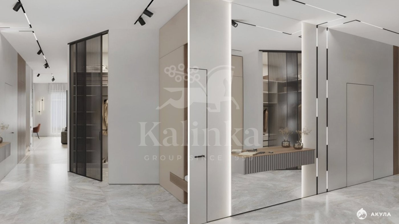 2 этаж: холл, 2 мастер-спальни с гардеробными и санузлами, 2 спальни с санузлами, балкон.