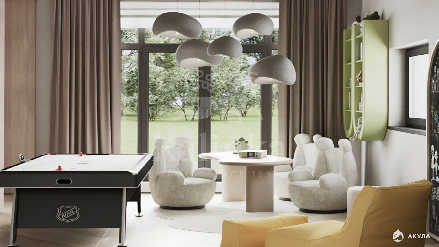 1 этаж: холл, кухня-гостиная с игровой зоной и террасой, кабинет, сауна с душевой и санузлом, гардеробная, постирочная-котельная, гараж;