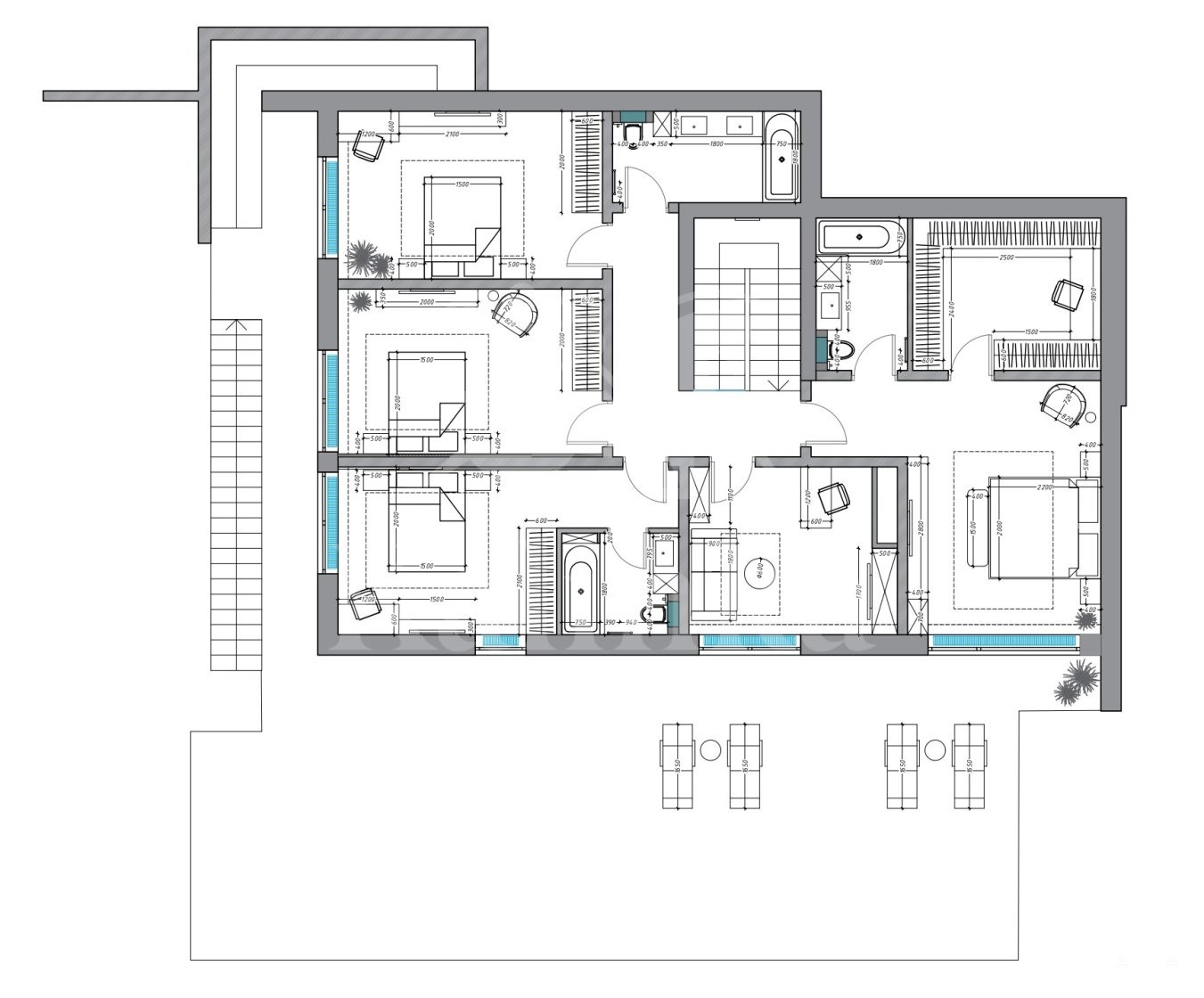 2 этаж: холл, мастер-спальня с гардеробной и с/у, постирочная, гардеробная, 2 спальни, с/у, кабинет, терраса.