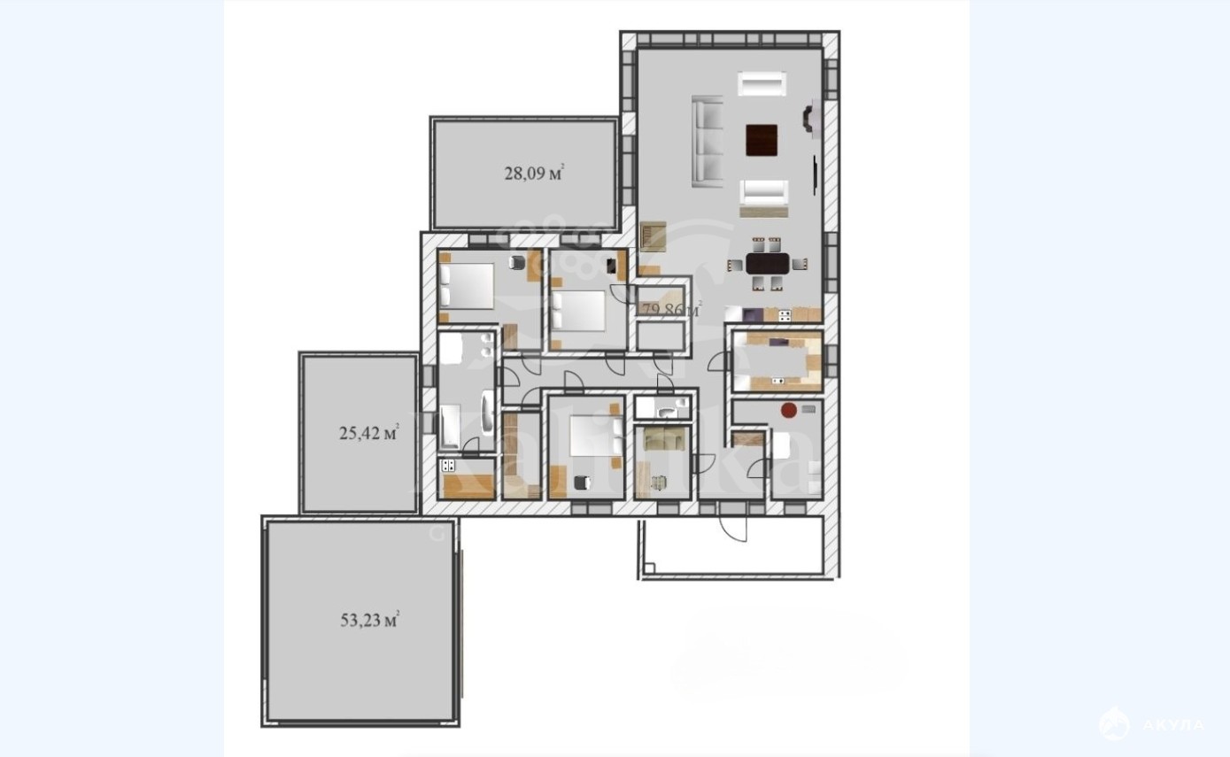 В планировке предусмотрены: просторная гостиная 68, 3 м. с панорамными окнами и возможностью установки камина, парадная кухня, терраса, мастер-спальня, 2 спальни, рабочая кухня, кабинет, 2 гардеробные, с/у гостевой, ванная комната с сауной и выходом на террасу, кладовая, котельная.