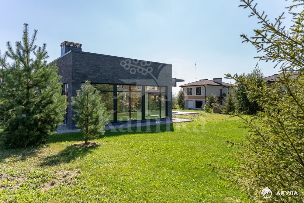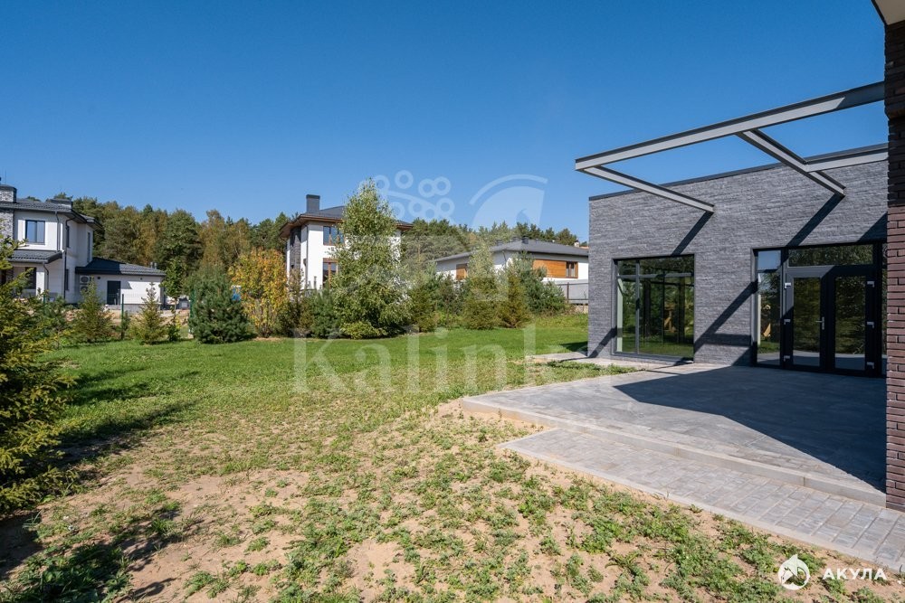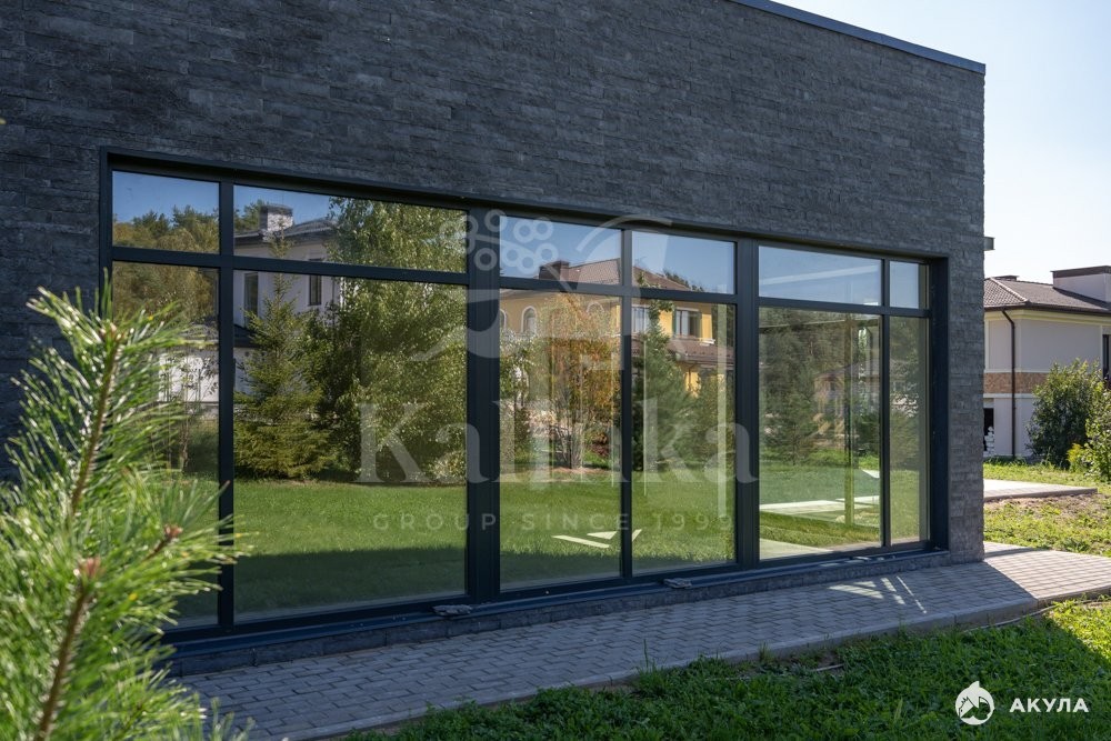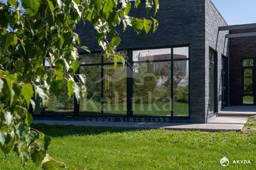 Дом выполнен в современном стиле с плоской кровлей, панорамным остеклением в пол, входная группа со сплошным остеклением, высокие потолки (до отделки 3, 6 м), высокие межкомнатные двери (проем 2, 6 м), функциональная, удобная планировка. Фасад отделан клинкером, сделана отмостка, вымощены дорожки (керамогранит и брусчатка). Теплый контур и отмостка полностью утеплены. Установлена система обогрева водосточных воронок, сделана система сбора дренажных и ливневых вод. Фундамент дома - монолитная ребристая плита, стены из керамзитобетонных блоков с утеплением из экструдированного пенополистирола облицованы плиткой, окна энергосберегающие, перекрытие монолитное, кровля мембрана ПВХ. Внутренние помещения подготовлены под чистовую отделку.
