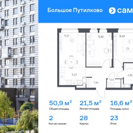 Строим кварталы для жизни с заботой о будущем. Предлагается 2-комнатная квартира комфорт-класса 50, 9 кв.м в корпусе 28 на 23 этаже, в ЖК «Большое Путилково» Квартира без отделки. Доступность опции «отделка» и возможность комплектации мебелью и декором уточняйте у...