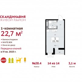 Просторная 1-комн. квартира бизнес-класса-студия с предчистовой отделкой в ЖК "Скандинавия" на 14 этаже. Общая площадь: 22.7 кв.м., площадь гостиной 16 кв.м., из которых 6 кв.м. выделено под кухонную зону. Все окна выходят на одну сторону. В квартире одна лоджия, один совмещенный...