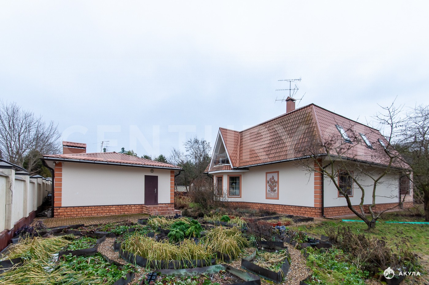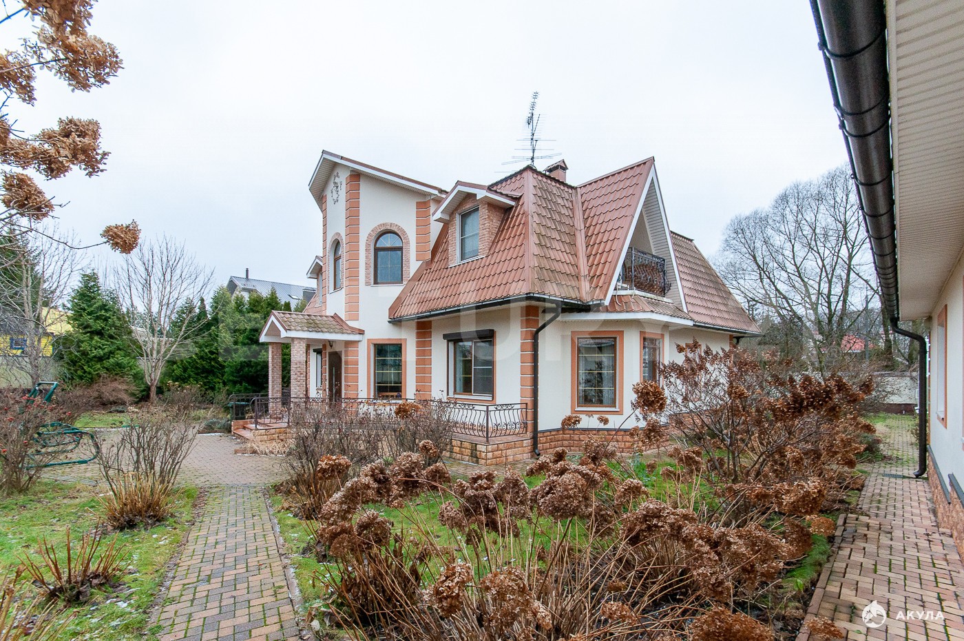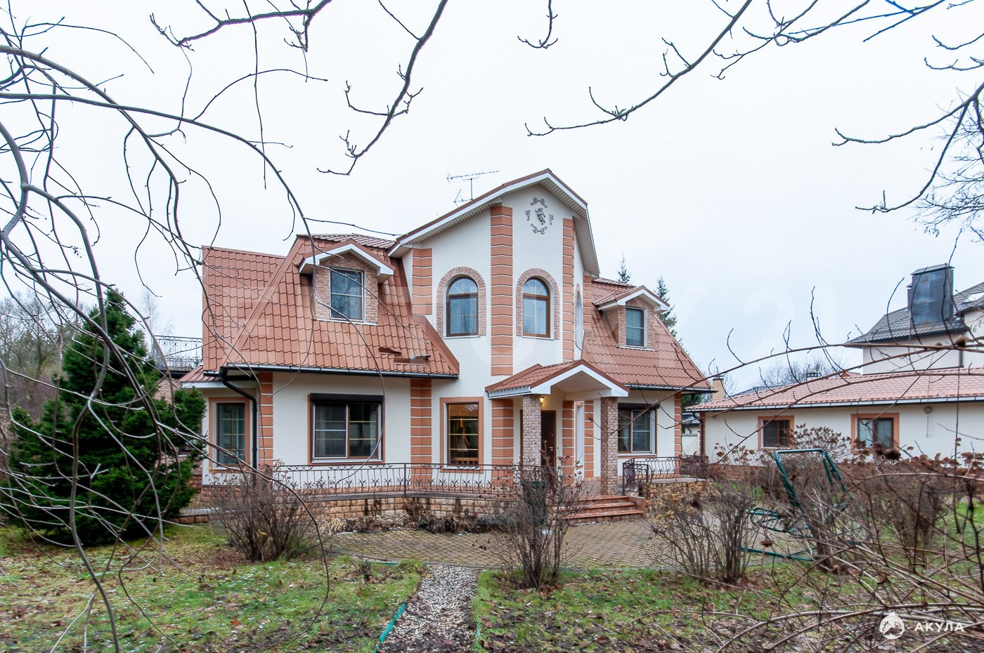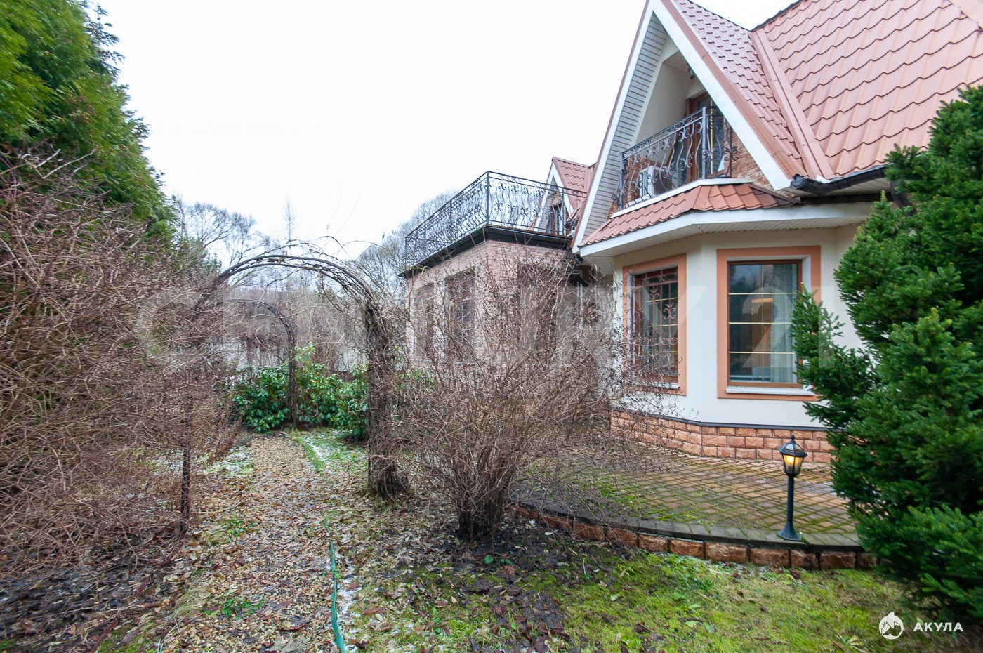 Участок благоустроен: выполнен ландшафтный дизайн, высажены деревья редких пород, организована наружная подсветка дома и территории по периметру.