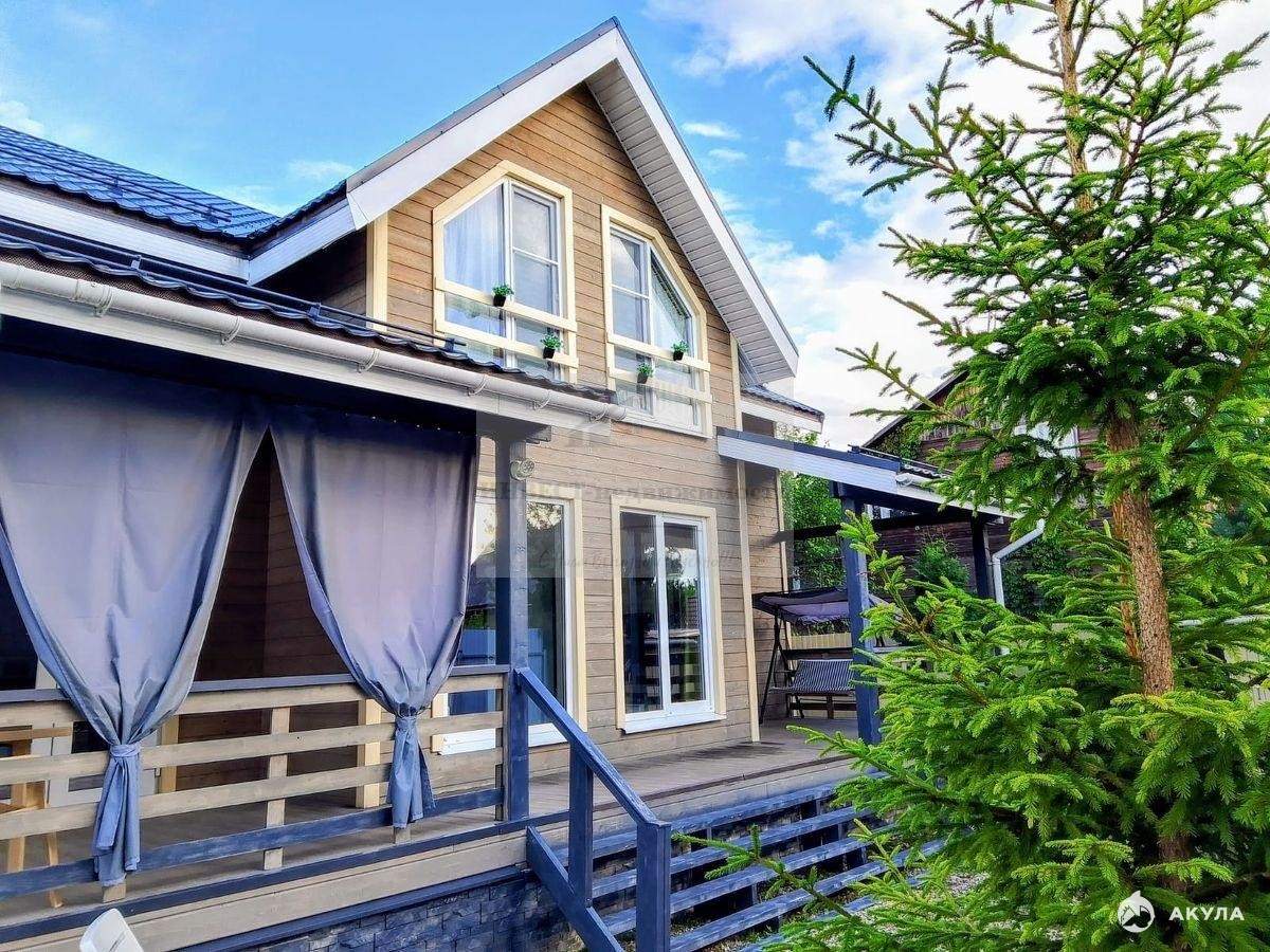 Наружная отделка светло-бежевого цвета. Фасад украшен вертикальными и горизонтальными панелями, создающими аккуратный и стильный вид. Крыша двускатная, покрыта тёмно-синей металлочерепицей, который отлично сочетается с общим цветом дома. Окна большие, светлые, с белыми рамами — на центральной части дома они выполнены в виде высоких витражей, пропускающих много света внутрь. Входная зона оформлена просторной верандой с перилами и ступеньками. Фундамент дома высокий, на СВАЯХ, облицован светлым камнем, что придаёт устойчивость и дополнительную декоративность. Всё вместе выглядит современно, светло и уютно.