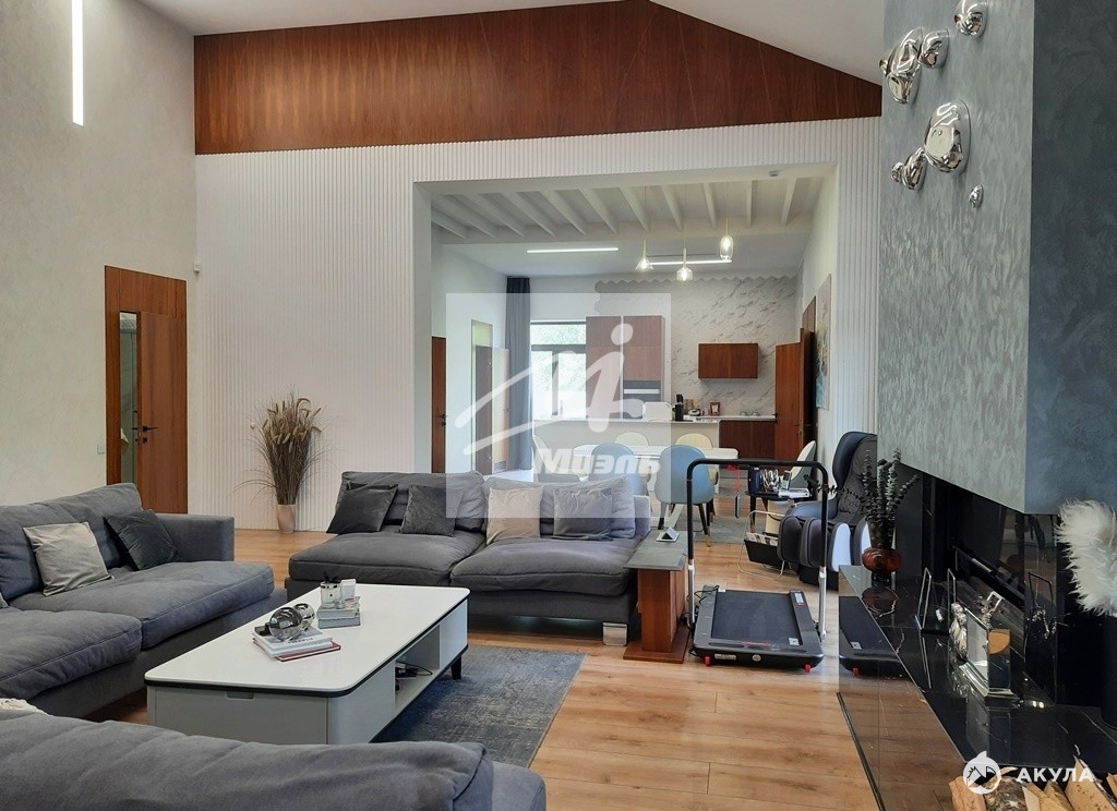 - Единое пространство кухни-гостиной (90 кв. м) с дровяным камином и выходом на террасу (дополнительно 32 кв. м к площади дома)