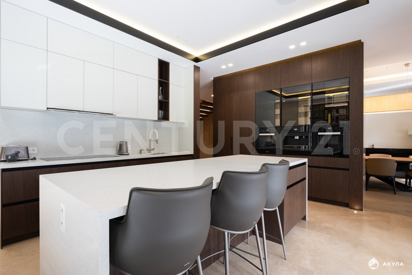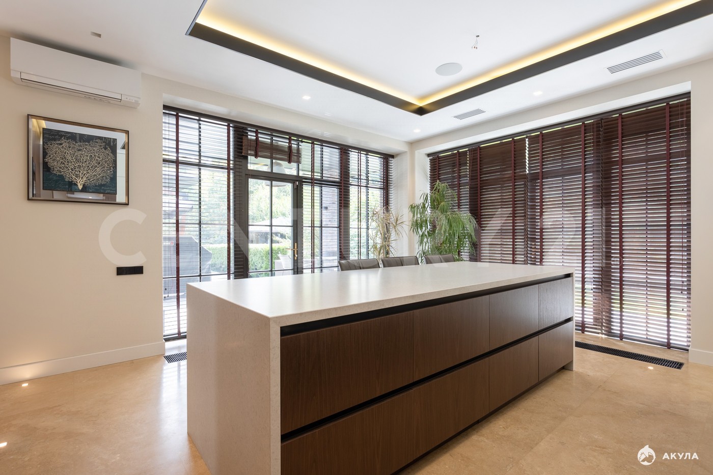 На первом этаже спланированы: гостиная с каминной зоной, просторная кухня оснащенная премиальной техникой, столовая, кабинет, гостевая комната, барная комната с караоке с выходом на террасу, переливной бассейн с гидромассажем и противотоком, баня, 3 с/у.