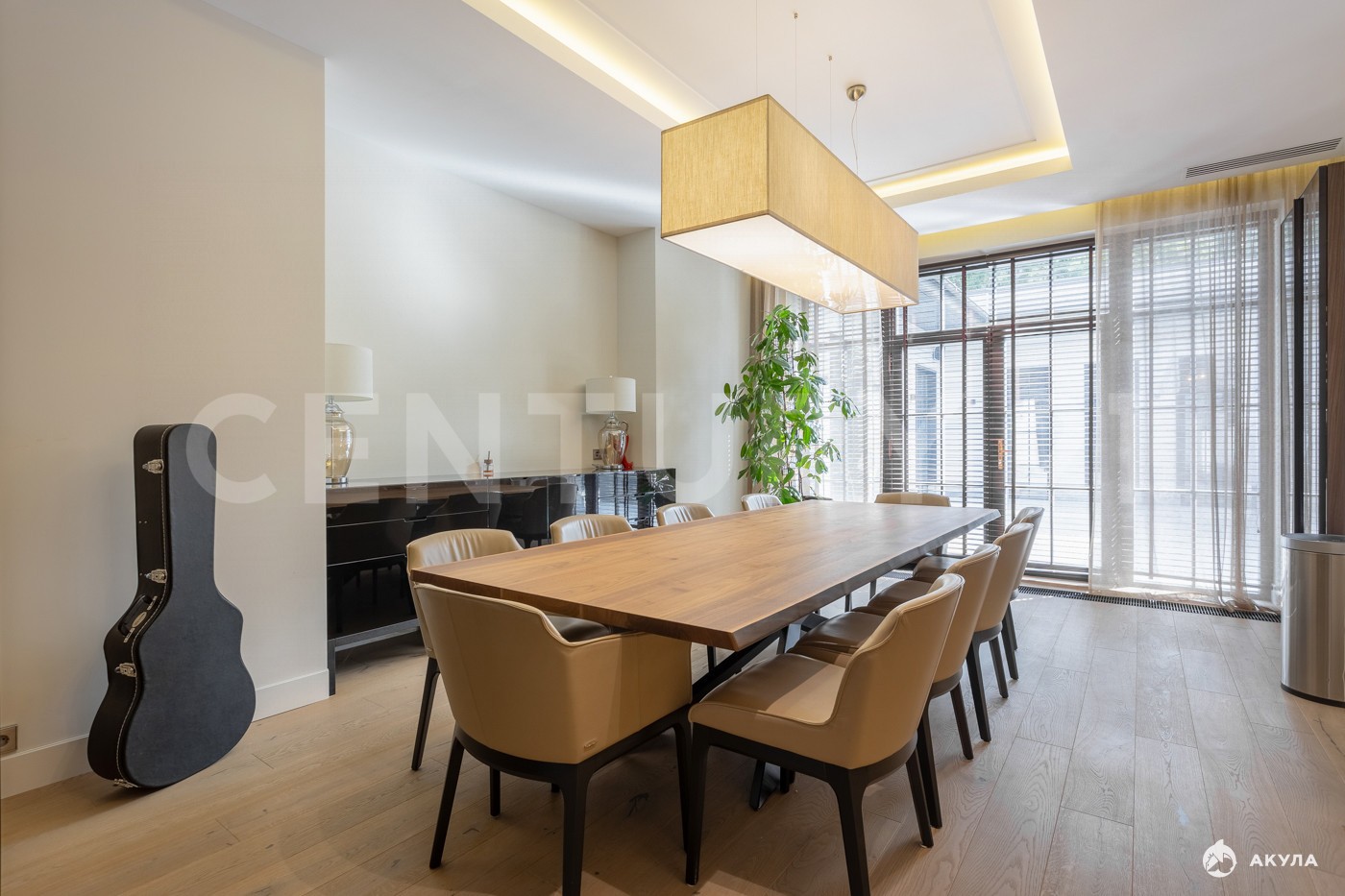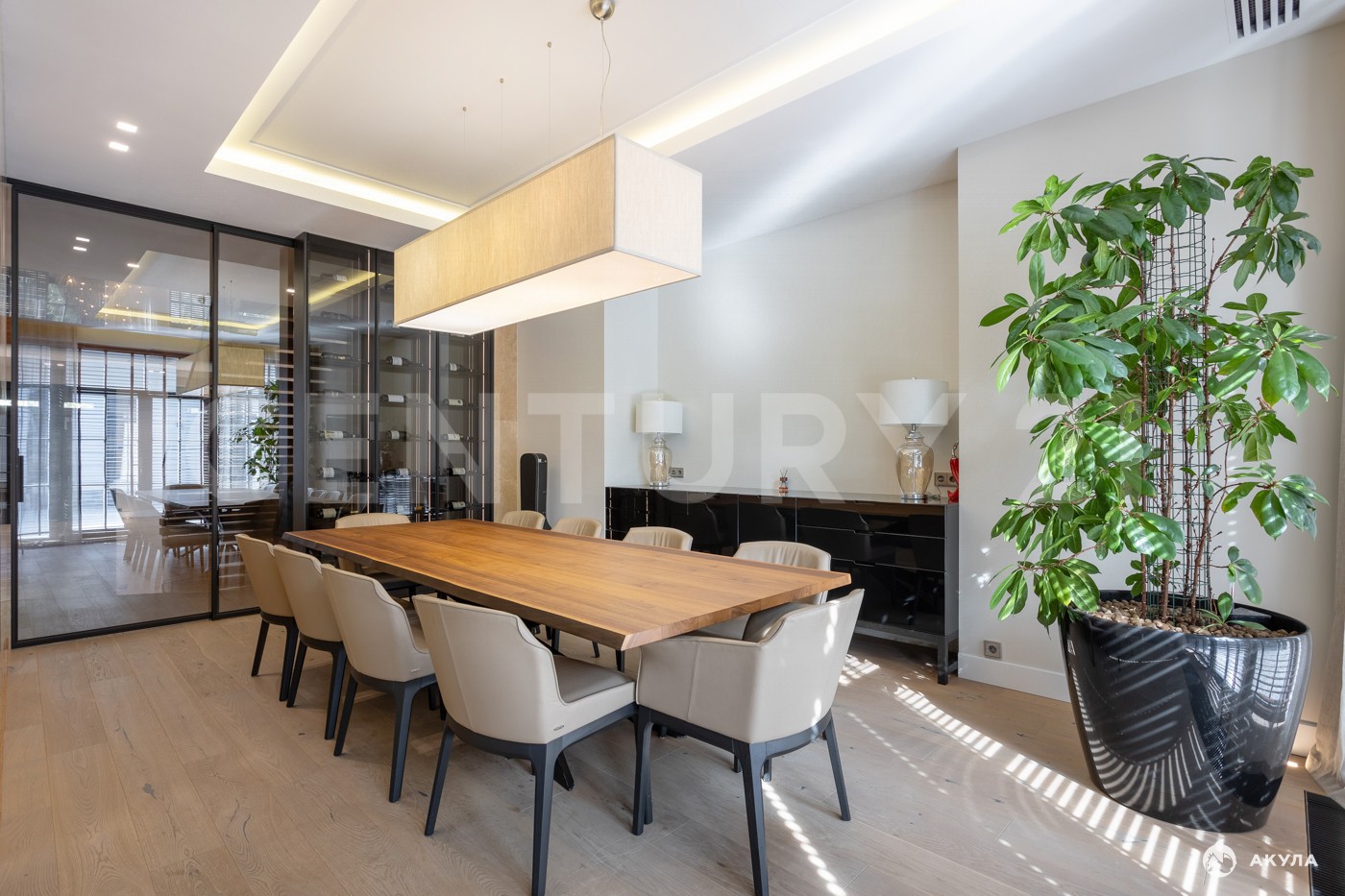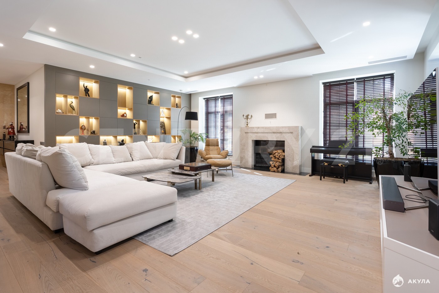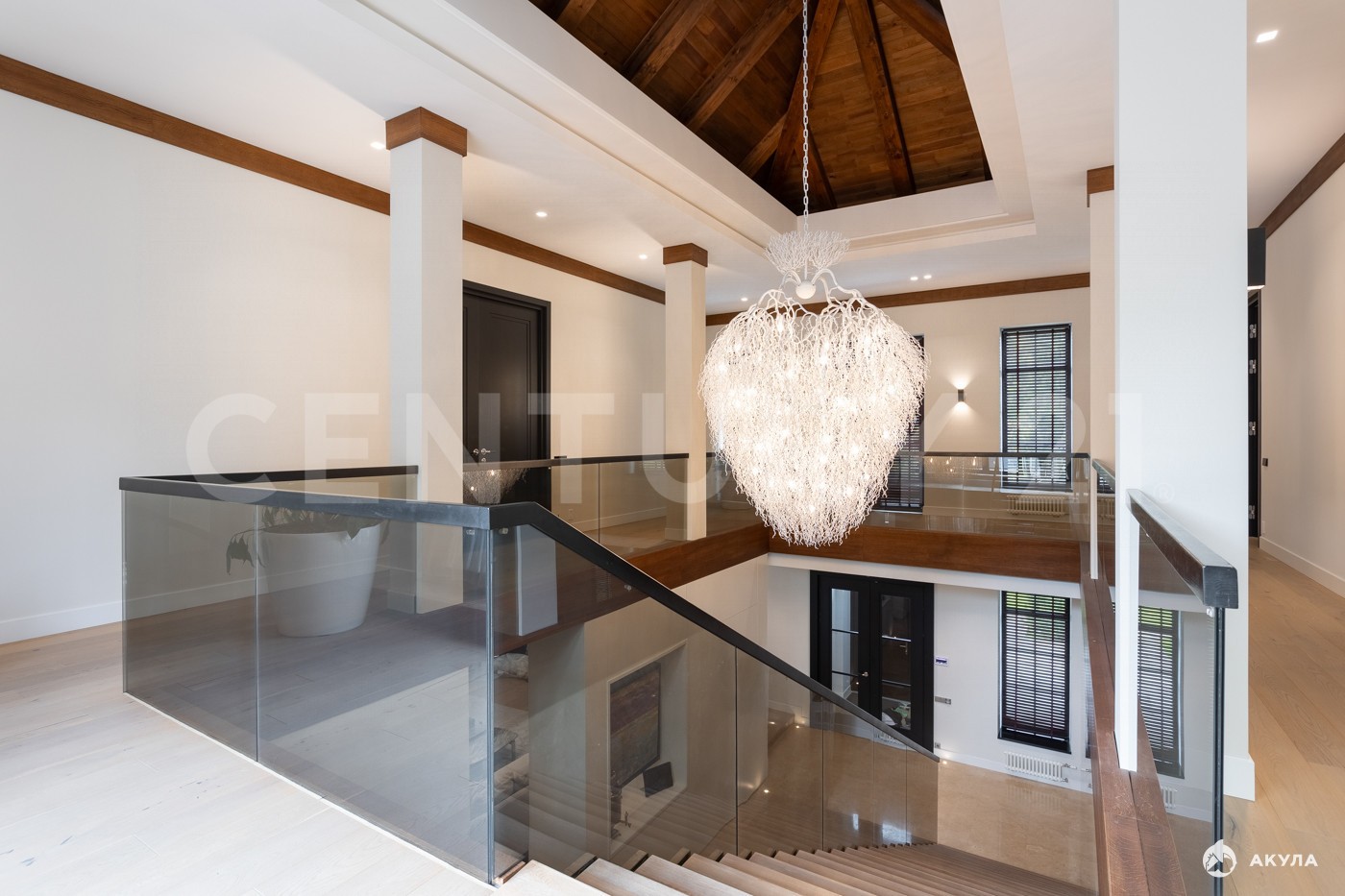 Современная архитектура и дизайнерская отделка из натуральных материалов: травертин, ценные породы дерева, мрамор. Элегантная "парящая" лестница и высокие потолки с авторской люстрой создают ощущение простора и роскоши.