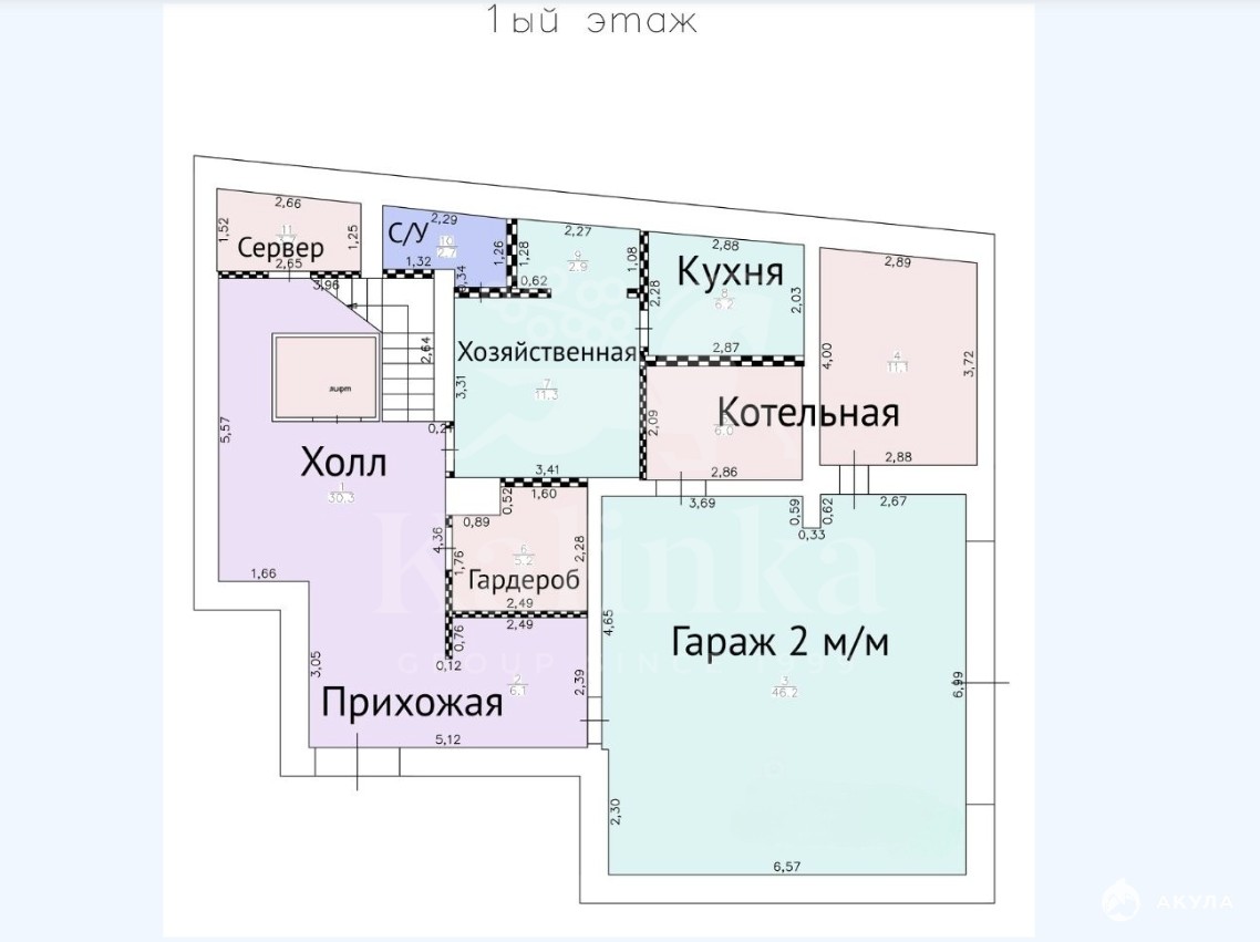 1 этаж: прихожая, холл, гардеробная, серверная, гараж на 2 машины, котельная, кухня, кладовая.