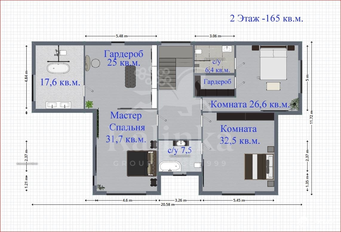 2 этаж: холл, мастер-блок: спальня, гардероб (премиум класса, зонирован стеклянной тонированной перегородкой), просторная ванная комната (установлена отдельно стоящая мраморная ванна, декоративная стена из натурального камня — оникс, большая душевая, каменная тумба на две раковины, подогрев пола); спальня с с/у, спальня с с/у и гардеробом.