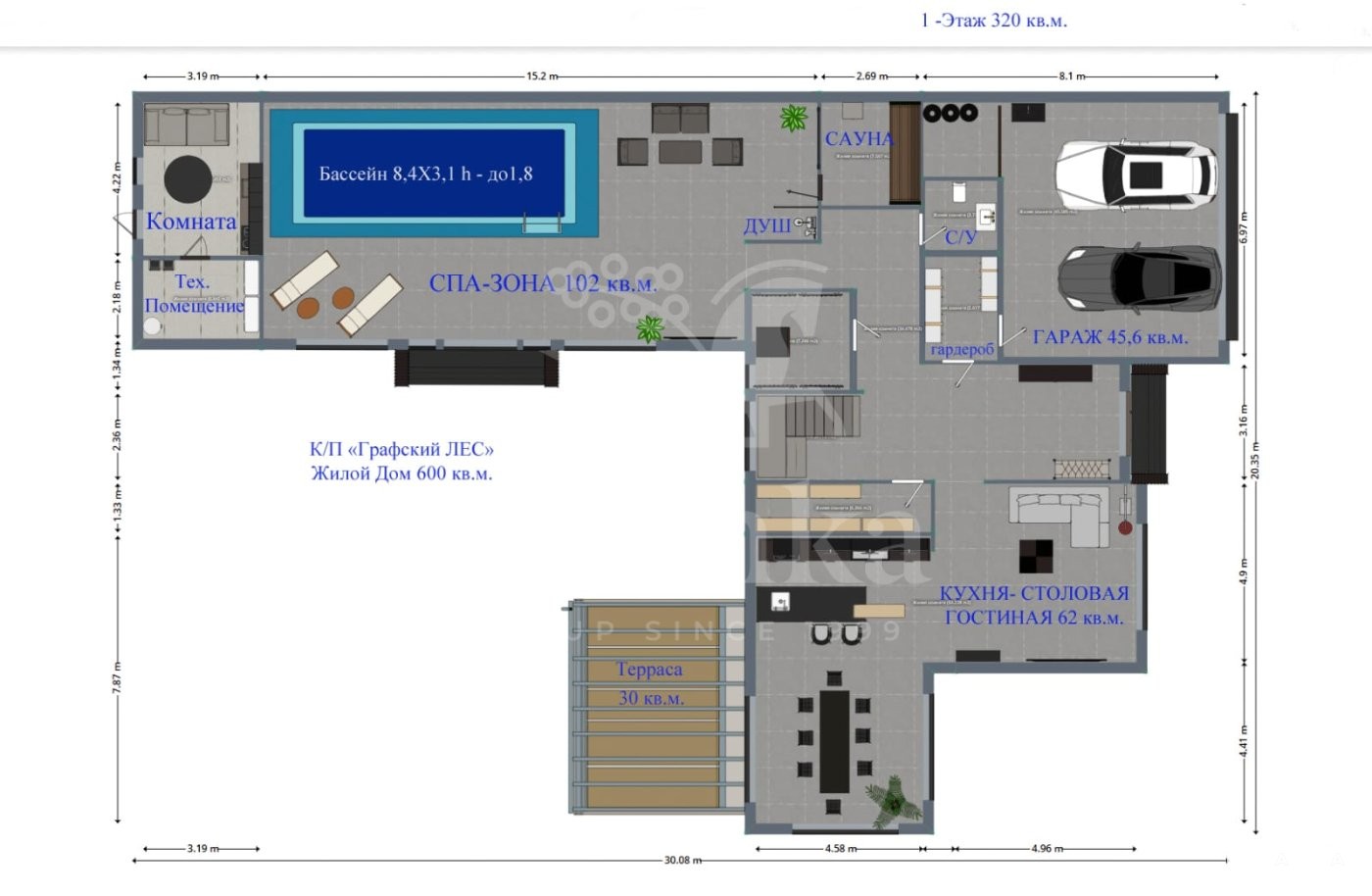 1 этаж: просторный и светлый холл, гардероб, кухня-столовая с панорамным остеклением и выходом на летнюю террасу (на кухне установлена новая мебель с функциональным островом от студии «Giulia Novars» с бытовой техникой Kuppersbusch и LIEBHERR, каменной и шпонированной столешницей), гостиная с дровяным камином, санузел, бойлерная, кладовая, гараж на 2 машины. СПА-зона (102 кв. м) с современными техническими решениями: бассейн (чаша 3x8 м, глубина до 1, 8 м), просторная зона для занятий спортом и местом для диванов и телевизора. Отделка чаши выполнена из натуральной мозаики, установлен противоток с регулировкой мощности и подачей кислорода, подводное освещение, приточно-вытяжная вентиляция с подогревом (теплые полы; нагрев воды и воздуха в бассейне от газового котла), душевая, сауна с автоматическим управлением, панно из гималайской соли, панорамное остекление с красивыми видами на бассейн, современное освещение, выход на участок (оборудование для бассейна установлено в дальней части дома, что исключает попадание шума в жилую зону). Помещение для персонала (13, 5 кв. м) с собственным с/у и входом с участка.