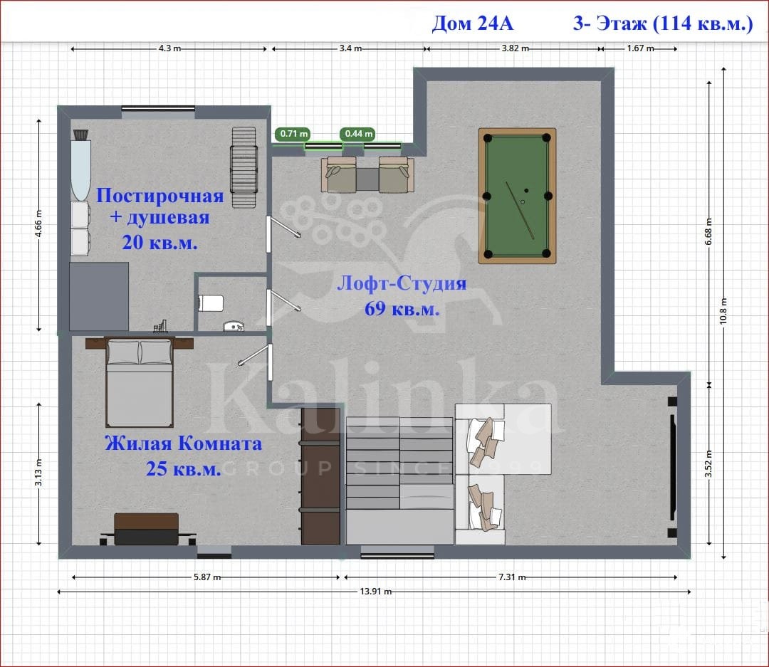 3 этаж: светлая и просторная лофт-студия, комната, с/у, постирочная с душевой.