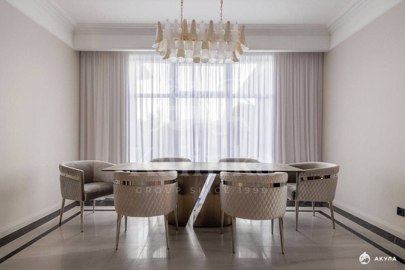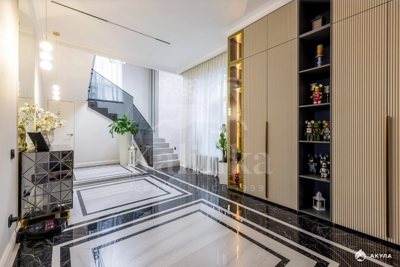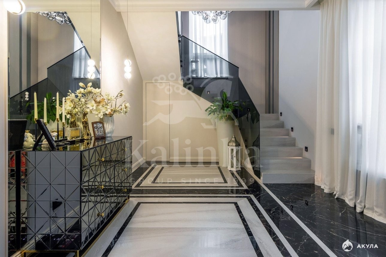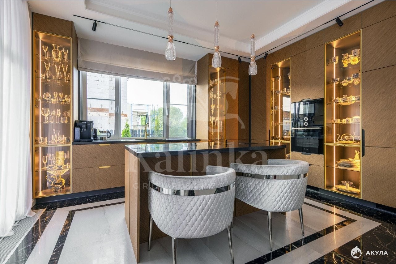 Фасад дома облицован клинкерным кирпичом, крыша — мягкая черепица. Интерьер выполнен с использованием премиальных материалов: паркетная доска, теплый пол, панорамные окна. Установлены системы приточной вентиляции и кондиционирования. Кухня Mr.Doors, встроенная премиальная техника, варочная панель с интегрированной вытяжкой, два холодильника.