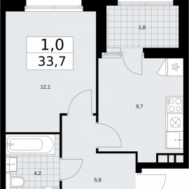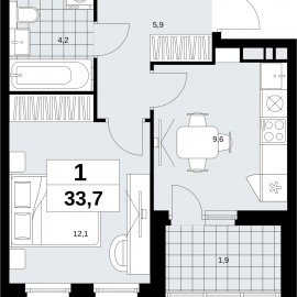 Просторная 1-комн. квартира в ЖК "Бунинские кварталы" на 10 этаже. Квартира без отделки, полностью готова к чистовой отделке и дальнейшему ремонту. Общая площадь: 33.7 кв.м., жилая: 12.1 кв.м., площадь просторной кухни-столовой: 9.7 кв.м. Все окна выходят на одну сторону. В квартире...