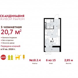 1-комн. квартира-студия в ЖК "Скандинавия" на 6 этаже. Квартира без отделки, после выдачи ключей можно делать ремонт. Общая площадь: 20.7 кв.м., площадь гостиной 12.5 кв.м., из которых 5.2 кв.м. выделено под кухонную зону. Все окна выходят на одну сторону. В квартире один балкон, один...