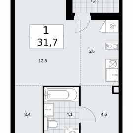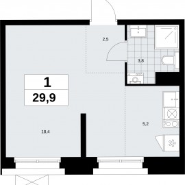 1-комн. квартира-студия от застройщика в ЖК "Прокшино" на 7 этаже. Квартира без отделки, полностью готова к чистовой отделке и дальнейшему ремонту. Общая площадь: 29.9 кв.м., площадь гостиной 23.6 кв.м., из которых 5.2 кв.м. выделено под кухонную зону. Все окна выходят на одну сторону....
