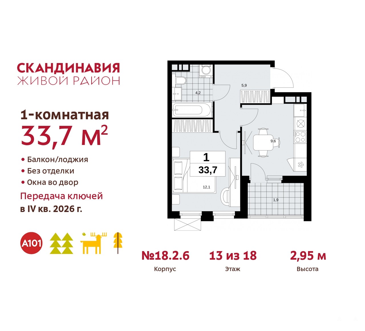 Просторная однокомнатная квартира в ЖК "Скандинавия" на 13 этаже. Квартира без отделки, полностью готова к ремонту. Общая площадь: 33.7 кв.м., жилая: 12.1 кв.м., площадь просторной кухни-столовой: 9.6 кв.м. Все окна выходят на одну сторону. В квартире одна лоджия, один совмещенный санузел. Высота потолков 2.95 м.