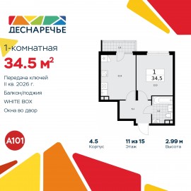 Однокомнатная квартира с предчистовой отделкой в ЖК "Деснаречье" на 11 этаже. Общая площадь: 34.5 кв.м., жилая: 12 кв.м., площадь просторной кухни-столовой: 12 кв.м. Все окна выходят на одну сторону. В квартире один балкон, один совмещенный санузел. Высота потолков 2.99 м. Эта квартира...
