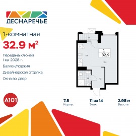 Продается однокомнатная квартира-студия с отделкой в ЖК "Деснаречье" на 11 этаже. Общая площадь: 32.9 кв.м., площадь гостиной 23.2 кв.м., из которых 6.4 кв.м. выделено под кухонную зону. Все окна выходят на одну сторону. В квартире одна лоджия, один совмещенный санузел. Высота...