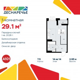 Однокомнатная квартира-студия с отделкой в ЖК "Деснаречье" на 14 этаже. Общая площадь: 29.1 кв.м., площадь гостиной 19.8 кв.м., из которых 5.2 кв.м. выделено под кухонную зону. Все окна выходят на одну сторону. В квартире одна лоджия, один совмещенный санузел. Высота потолков 2.95 м. Эта...