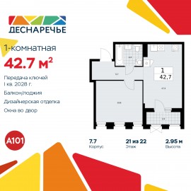 Продается однокомнатная квартира от застройщика с отделкой в ЖК "Деснаречье" на 21 этаже. Общая площадь: 42.7 кв.м., жилая: 13.9 кв.м., площадь просторной кухни-столовой: 17.3 кв.м. Все окна выходят на одну сторону. В квартире одна лоджия, один совмещенный санузел. Высота потолков 2.95...