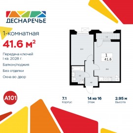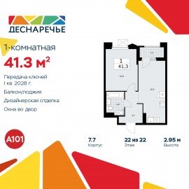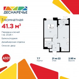 Однокомнатная квартира от застройщика с отделкой в ЖК "Деснаречье" на 21 этаже. Общая площадь: 41.3 кв.м., жилая: 13.8 кв.м., площадь просторной кухни-столовой: 16.2 кв.м. Все окна выходят на одну сторону. В квартире одна лоджия, один совмещенный санузел. Высота потолков 2.95 м. Эта...