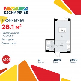 1-комн. квартира-студия от застройщика в ЖК "Деснаречье" на 4 этаже. Квартира без отделки, полностью готова к чистовой отделке и дальнейшему ремонту. Общая площадь: 28.1 кв.м., площадь гостиной 21 кв.м., из которых 6.3 кв.м. выделено под кухонную зону. Все окна выходят на одну сторону....