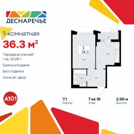 Однокомнатная квартира в ЖК "Деснаречье" на 7 этаже. Квартира без отделки, новый собственник может сделать ремонт по индивидуальному дизайн-проекту. Общая площадь: 36.3 кв.м., жилая: 14.4 кв.м., площадь просторной кухни-столовой: 10.5 кв.м. Все окна выходят на одну сторону. В квартире...