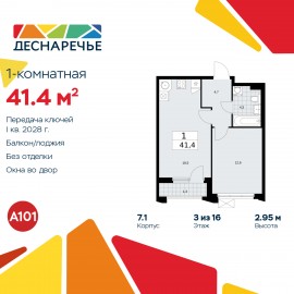 1-комн. квартира от застройщика с отделкой в ЖК "Деснаречье" на 18 этаже. Общая площадь: 34.7 кв.м., жилая: 12.5 кв.м., площадь просторной кухни-столовой: 10.6 кв.м. Все окна выходят на одну сторону. В квартире одна лоджия, один совмещенный санузел. Высота потолков 2.95 м. Эта квартира...