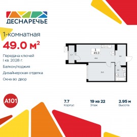 Однокомнатная квартира от застройщика с отделкой в ЖК "Деснаречье" на 19 этаже. Общая площадь: 49 кв.м., жилая: 15 кв.м., площадь просторной кухни-столовой: 20.9 кв.м. Все окна выходят на одну сторону. В квартире одна лоджия, один совмещенный санузел. Высота потолков 2.95 м. Эта...
