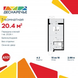 Просторная 1-комн. квартира-студия в ЖК "Деснаречье" на 15 этаже. Квартира без отделки, новый собственник может сделать ремонт по индивидуальному проекту. Общая площадь: 20.4 кв.м., площадь гостиной 13.6 кв.м., из которых 5.1 кв.м. выделено под кухонную зону. Все окна выходят на одну...