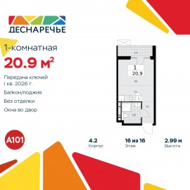 1-комн. квартира-студия в ЖК "Деснаречье" на 16 этаже. Квартира без отделки, после оформления собственности можно делать ремонт. Общая площадь: 20.9 кв.м., площадь гостиной 13.6 кв.м., из которых 5.1 кв.м. выделено под кухонную зону. Все окна выходят на одну сторону. В квартире один...