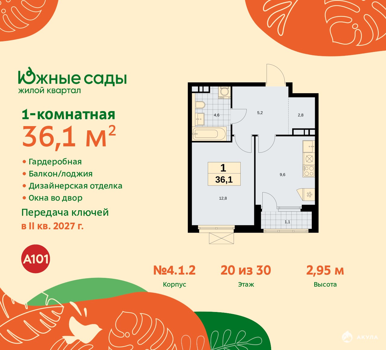 Продается 1-комн. квартира с отделкой в ЖК "Южные сады" на 20 этаже. Общая площадь: 36.1 кв.м., жилая: 12.8 кв.м., площадь просторной кухни-столовой: 9.5 кв.м. Все окна выходят на одну сторону. В квартире одна лоджия, один совмещенный санузел. Высота потолков 2.95 м.
